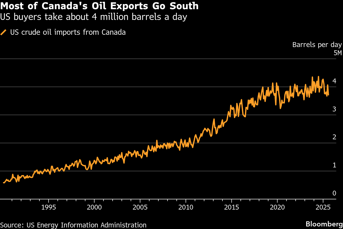 The prime minister told a business audience in Calgary that Canada’s tight interdependence with the US — once a strength — is now a weakness. The country shipped more than 95% of its energy exports to the country last year, before President Donald Trump began slapping tariffs on Canadian goods.