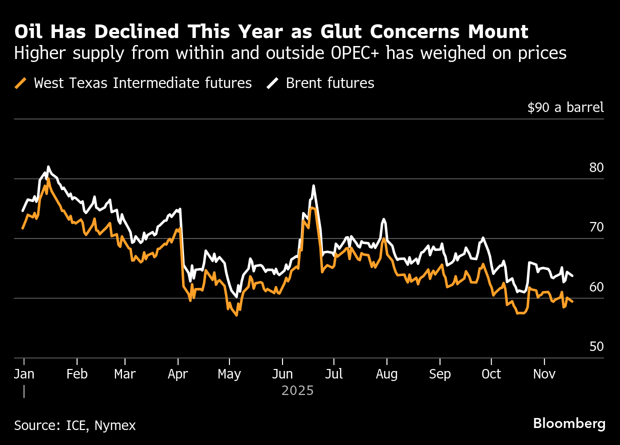 Global benchmark Brent has sunk 15% this year, making it one of the worst performing major commodities. The slump has come as OPEC+ ramps up quotas, and drillers outside the alliance also add supply. The International Energy Agency has forecast a record overhang, and in one sign of fragility, US futures’ nearest two contracts dipped into contango, a bearish pattern.