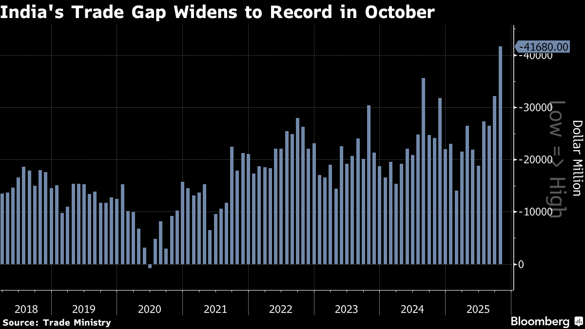US President Donald Trump slapped 50% tariffs on Indian goods in August, roiling financial markets and denting growth prospects for the South Asian nation. The record trade gap puts further pressure on the rupee, which is down 3.5% against the dollar this year and trading close to a record low.