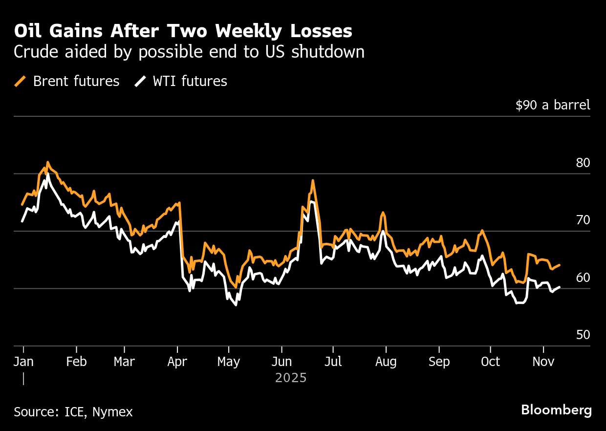 Brent climbed above $64 a barrel after two weekly declines, while West Texas Intermediate was near $60. In the US, the Senate took a major step toward re-opening the government, aiding stocks as well as most commodities.