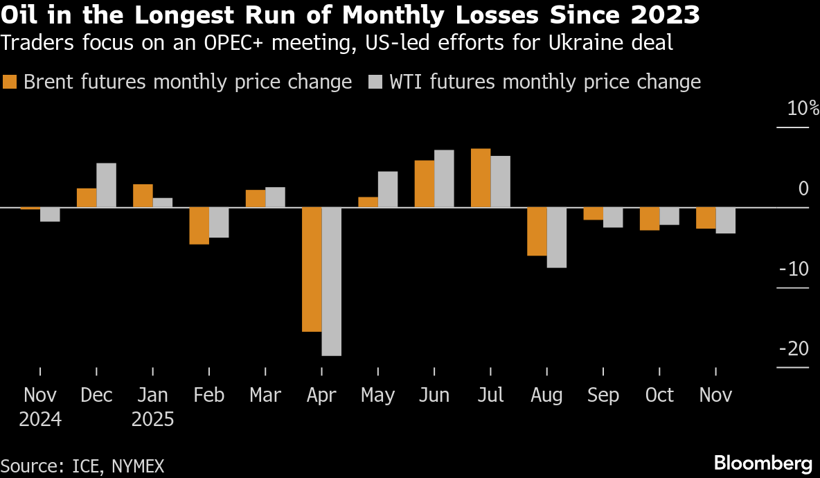 Brent steadied above $63 a barrel after a modest advance on Thursday, The global crude benchmark is on course for a fourth straight monthly drop in November, the longest such streak since the period through May 2023.