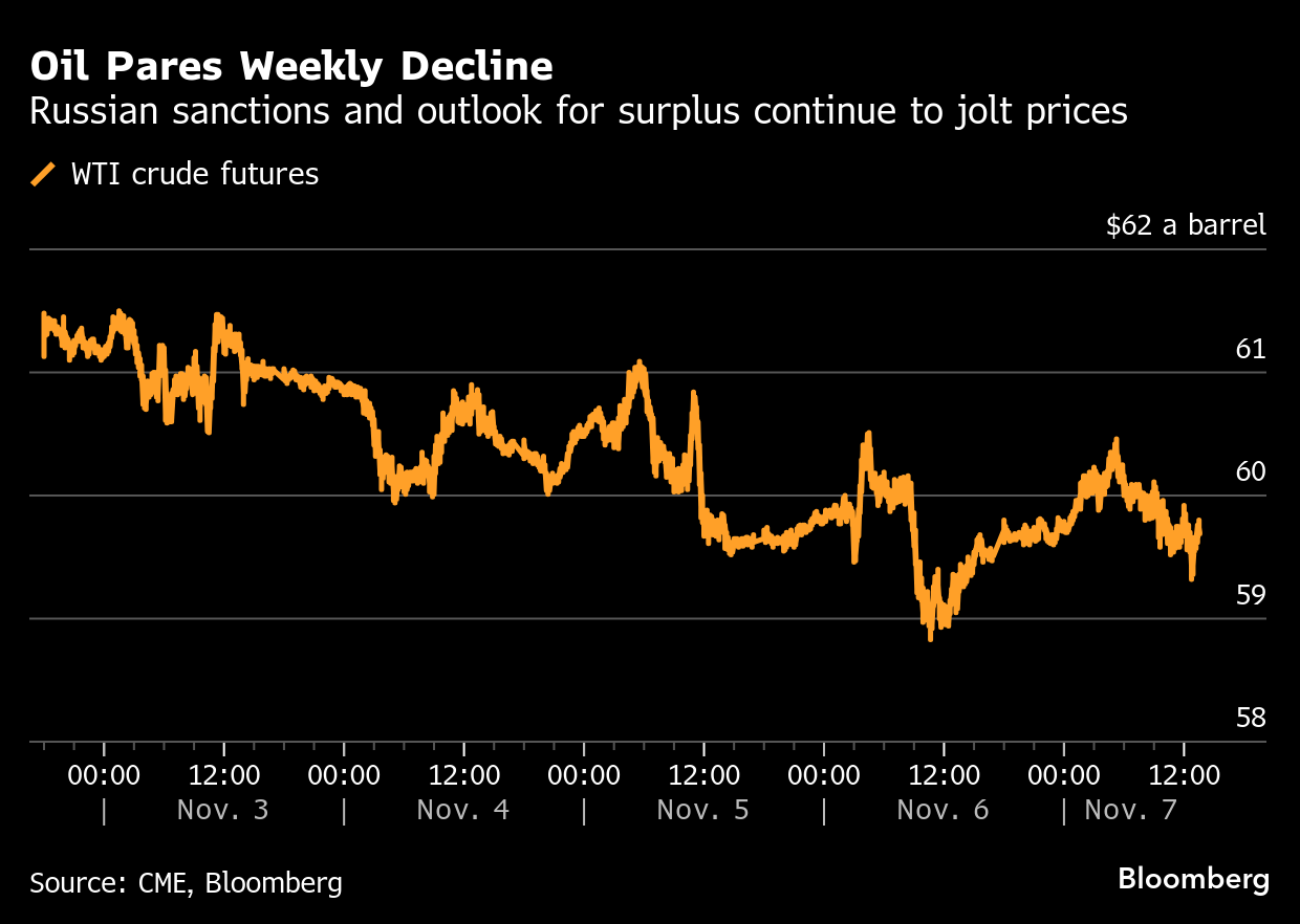 (Bloomberg) -- Oil rose on Friday but still notched a second weekly loss as the market continued to weigh the threat to output from sanctions on Russia against a looming oversupply.