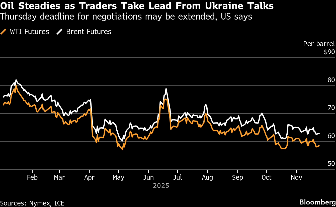 While oil followed other risk assets higher, traders awaited further news after Ukraine and its European allies signaled that key sticking points remained in US-brokered peace talks to end Russia’s invasion, even as senior officials hailed progress in winning more favorable terms for Kyiv.