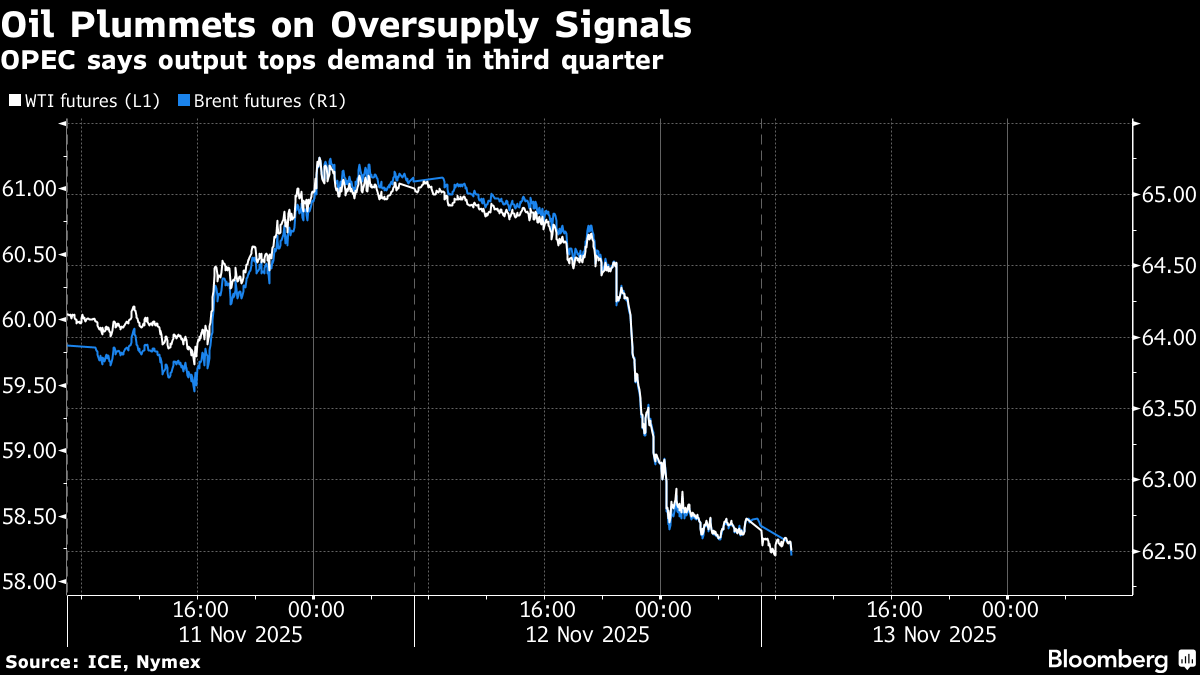 Global benchmark Brent held above $62 a barrel after losing almost 4% in the previous session, while West Texas Intermediate was near $58. Producer group OPEC — which has been restoring idled capacity this year — said in its latest market snapshot that global supply had topped demand in the third quarter, flipping its earlier estimate for the period from a shortfall.