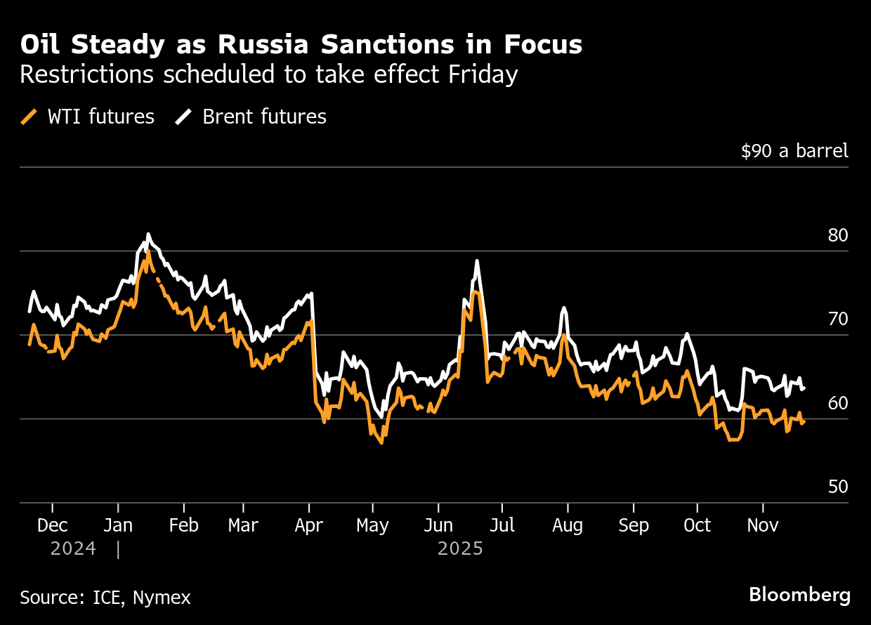 Brent traded near $64 a barrel after declining more than 2% on Wednesday, the most in a week, and West Texas Intermediate was below $60. US penalties on the Russian oil giants have already upended crude flows, most notably to India, and forced Lukoil to seek buyers for its international assets.