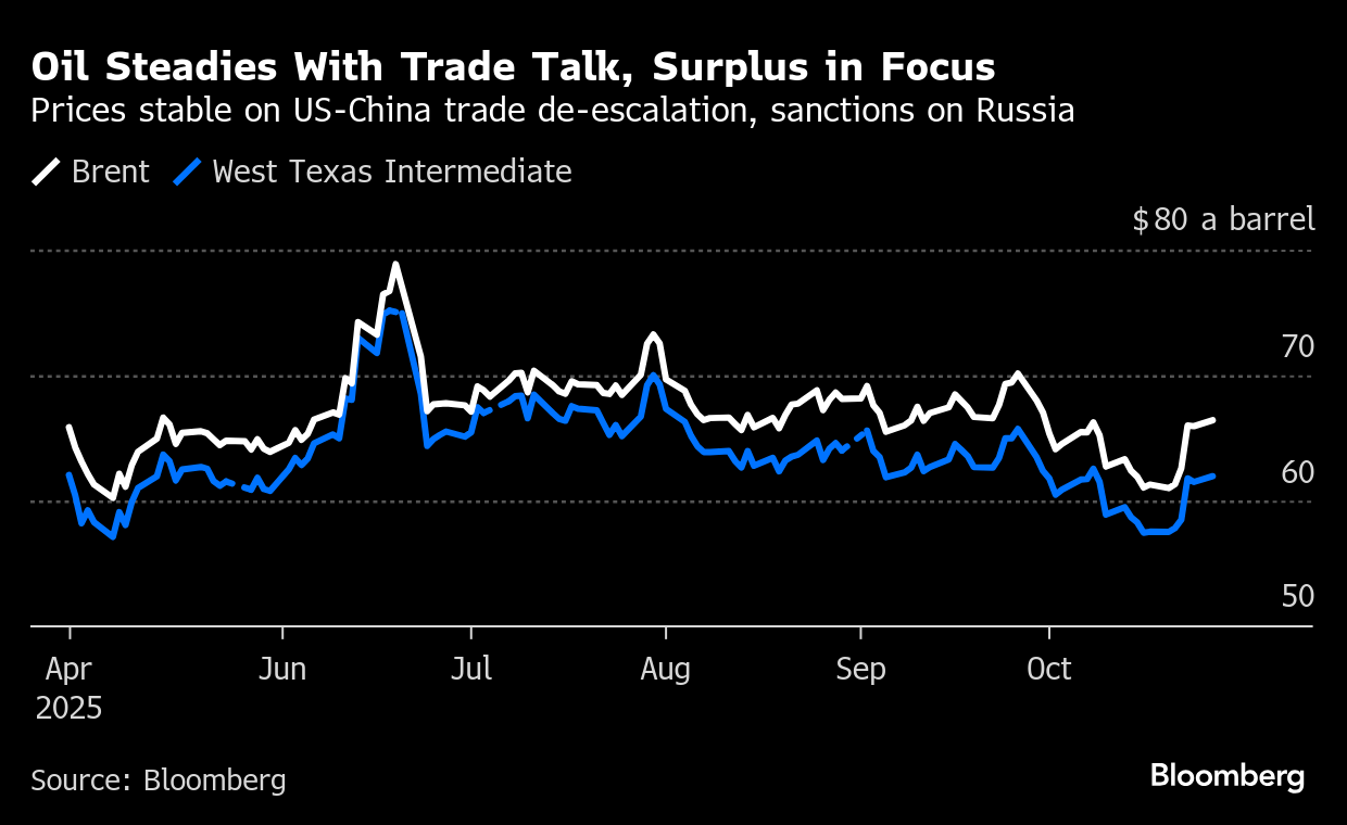 Oil rebounded from a five-month low last week — with Brent rallying by almost 8% — after US sanctions on Russia’s two biggest crude producers helped to counter the narrative of a building global surplus. Still, with the OPEC+ alliance continuing to add barrels, and some members including Kuwait suggesting there could be further increments, the concerns about a glut remain.