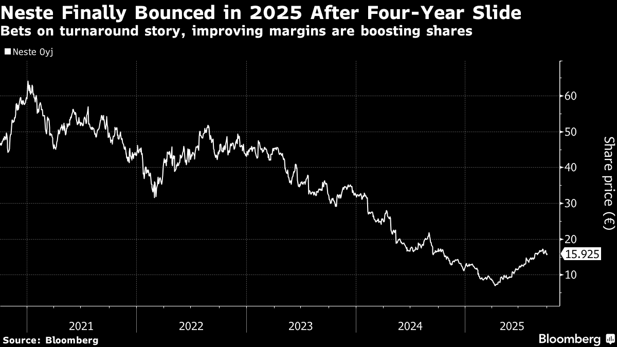 (Bloomberg) -- Shares in Finnish energy company Neste Oyj have staged one of Europe’s biggest rebounds this year, more than doubling since April. But with the renewable fuels market set to come under pressure, some analysts are warning the rally may soon end.