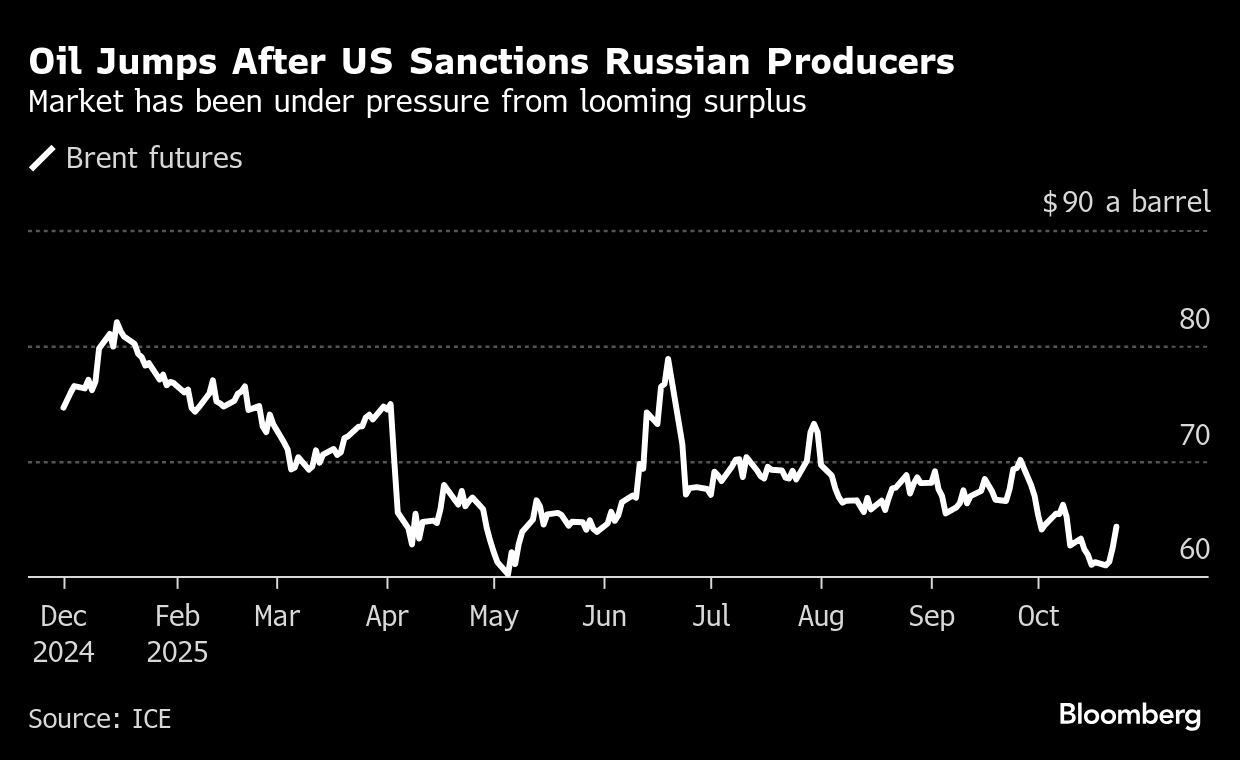 Brent advanced more than 3% to trade above $64 a barrel and West Texas Intermediate rallied past $60 after the US blacklisted state-run giant Rosneft PJSC and Lukoil PJSC, citing Moscow’s lack of commitment to peace in Ukraine. Senior refinery executives in India — a key buyer of Russian crude — said the restrictions would make it impossible for flows to continue.