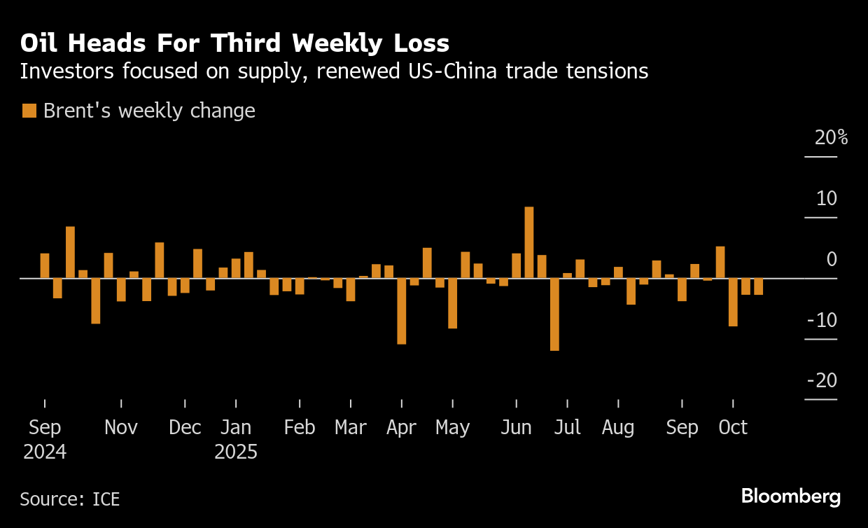 (Bloomberg) -- Oil headed for a third weekly decline as investors focused on oversupply and the fallout from renewed US-China trade tensions.
