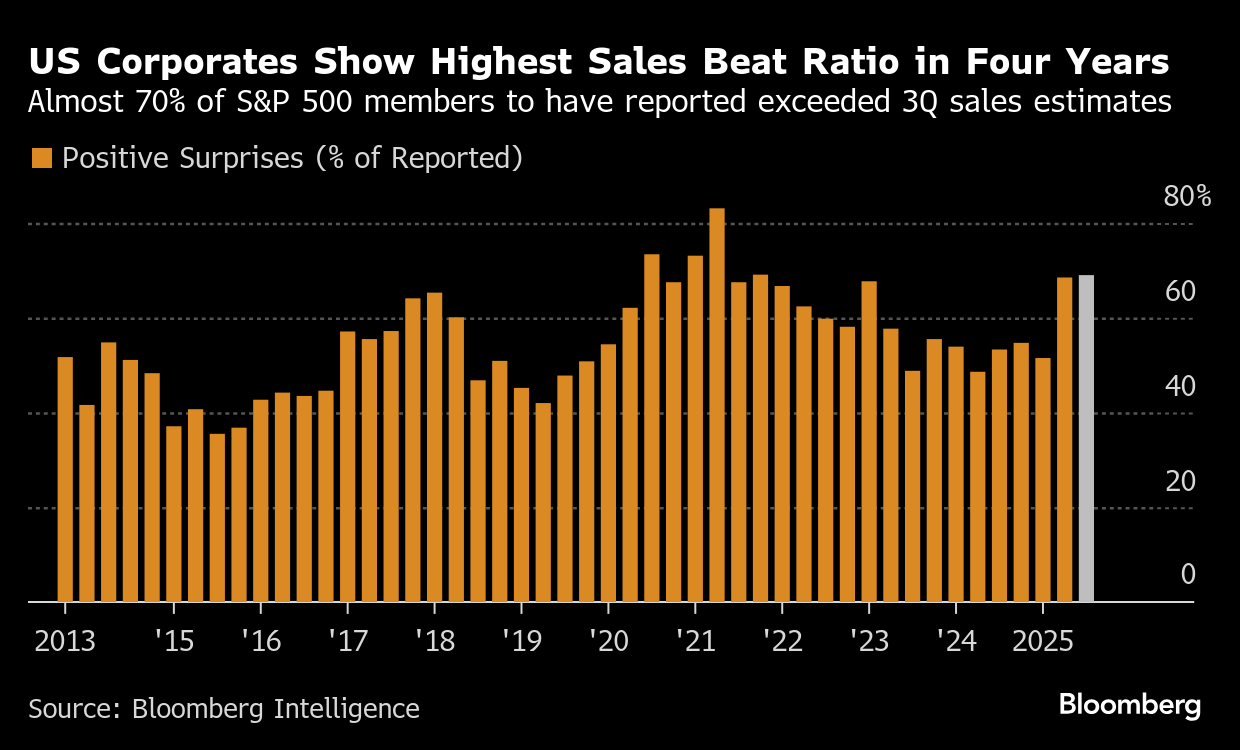 Easing trade tensions have helped fuel the stock rally, with US companies largely unscathed by tariffs so far. The S&P 500 is on course to have the most firms delivering sales beats in about four years. That optimism faces a reality check this week as investors look to the Fed meeting for clues on the path of rate cuts, while major technology firms including Meta Platforms Inc. and Microsoft Corp. reveal whether the artificial intelligence-fueled earnings momentum can be sustained.