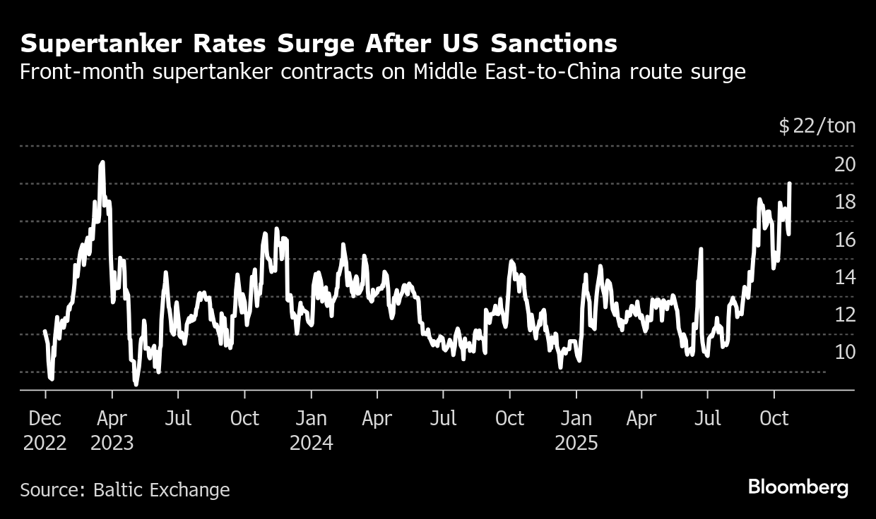 Front-month forward freight agreements on the benchmark Middle East-to-China route spiked almost 16% to the highest since early 2023 on Thursday, Baltic Exchange data show. Contracts for December on the same route undertaken by very-large crude carriers rose almost 13%.