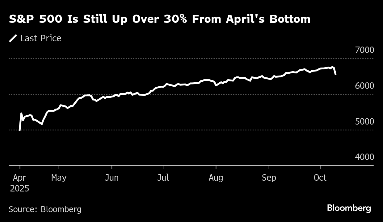 Since the tariff-fueled meltdown in April, the S&P 500 has surged on optimism about AI and hopes for Federal Reserve rate cuts. The gauge is trading near one of its highest valuations in 25 years — leaving a thin cushion for bad news.