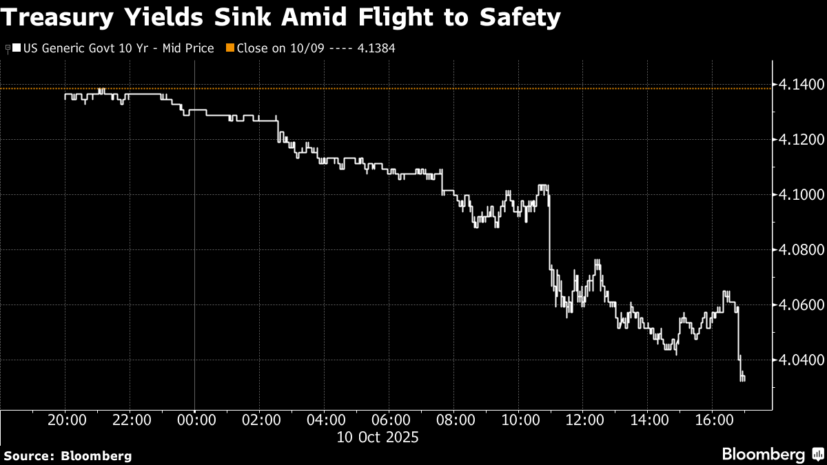 The S&P 500 saw its worst day since April. In another sign of stress, a key gauge of volatility - the VIX - topped 21. The yield on 10-year Treasuries sank 11 basis points to 4.03%. Bitcoin dropped about 5.5%. Commodities from copper to soybeans, wheat and cotton slumped.