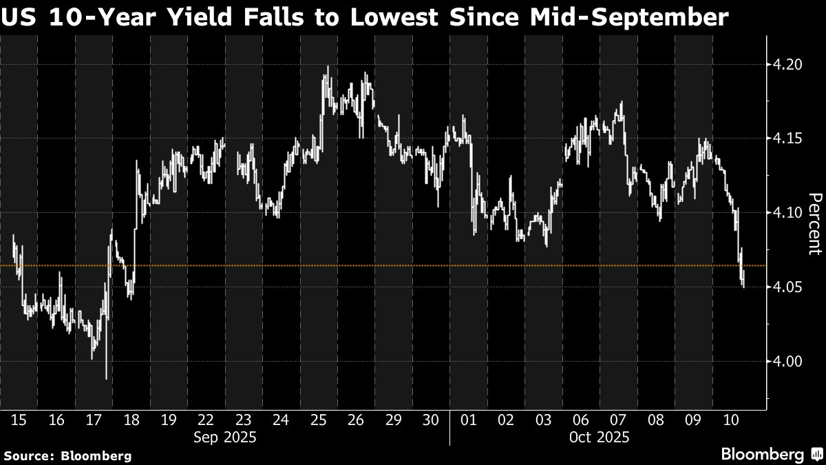 Yields across maturities fell at least seven basis points to the lowest levels since mid-September after Trump’s comment in a social-media post. The rates were already several basis points lower on the day as investors reacted to evidence the US government shutdown may be curtailing economic activity.