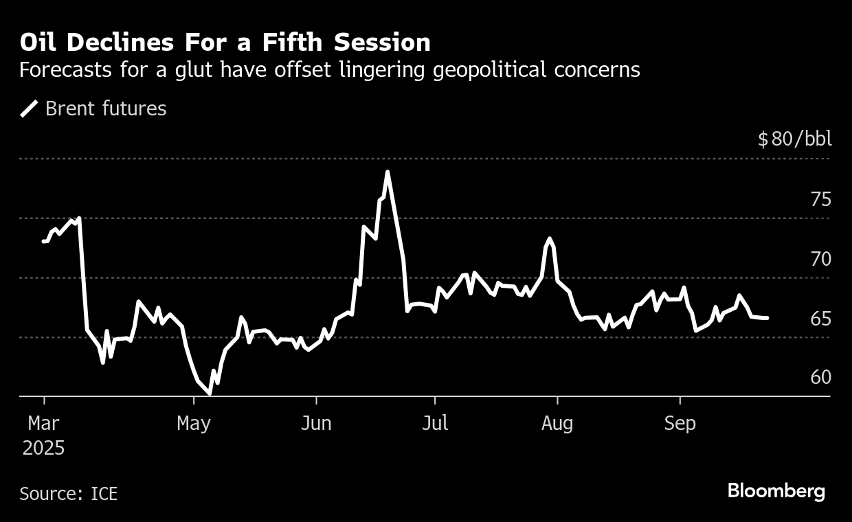 (Bloomberg) -- Oil dropped for a fifth day — on pace for the longest losing run since early August — on signs that global supplies are set to increase, potentially feeding a surplus in the fourth quarter and into 2026.