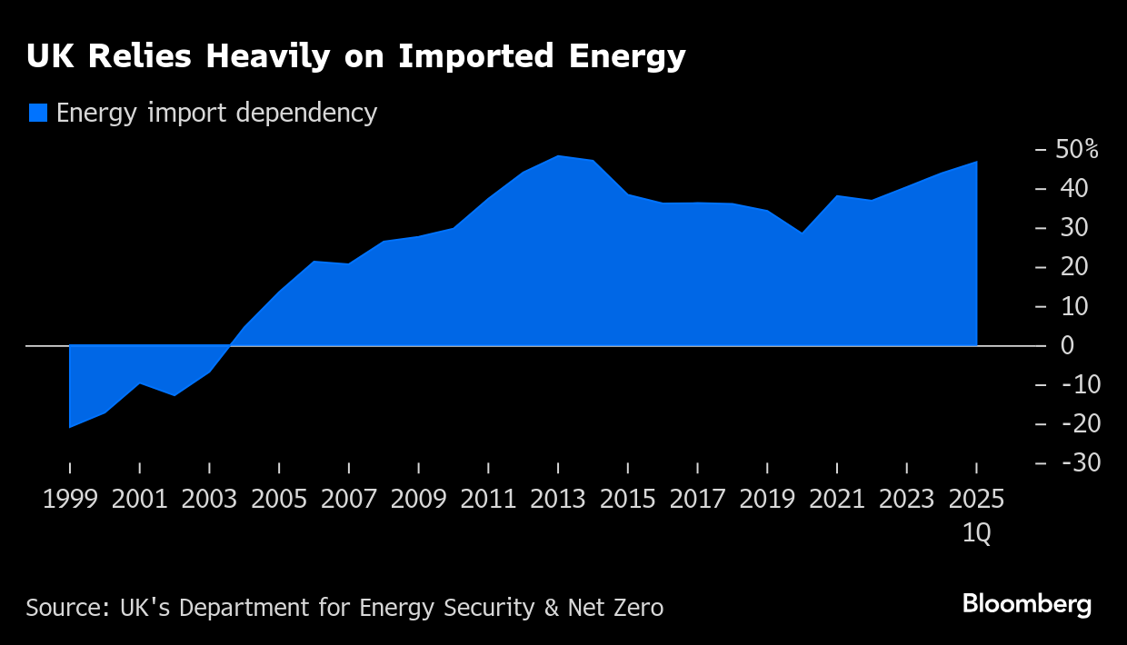 The UK’s reliance on imports for its energy needs has remained above 40% in recent years, making consumers vulnerable to volatile global prices amid geopolitical uncertainty.