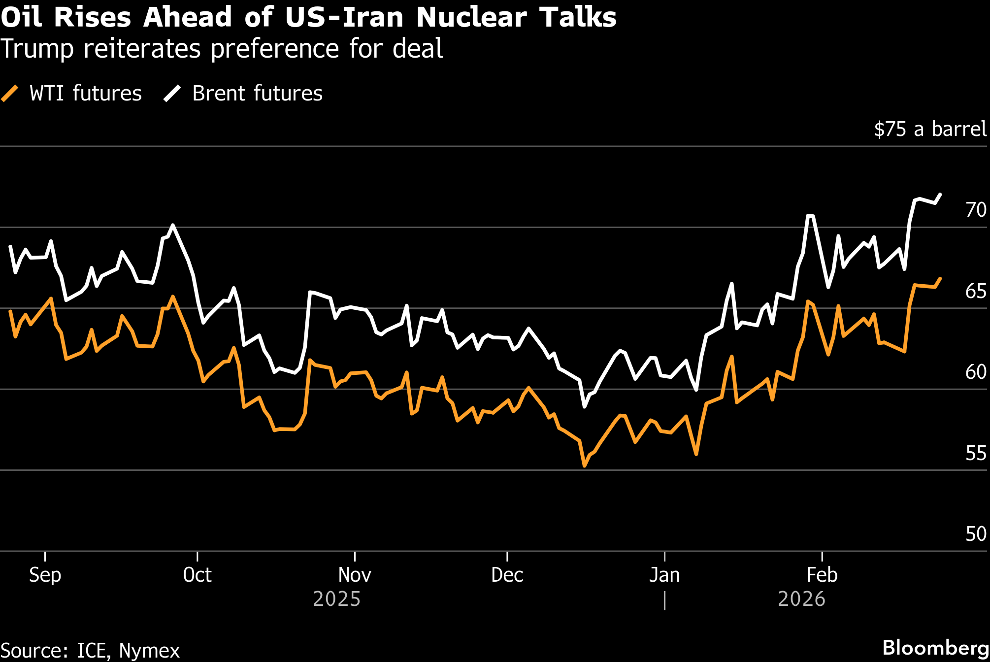 Brent traded near $72 a barrel after closing slightly lower on Monday, and West Texas Intermediate was near $67. Trump said in a social media post it will be a “very bad day” for Iran if a deal isn’t agreed, and pushed back on reports the Pentagon was worried an extended military campaign may prove difficult.