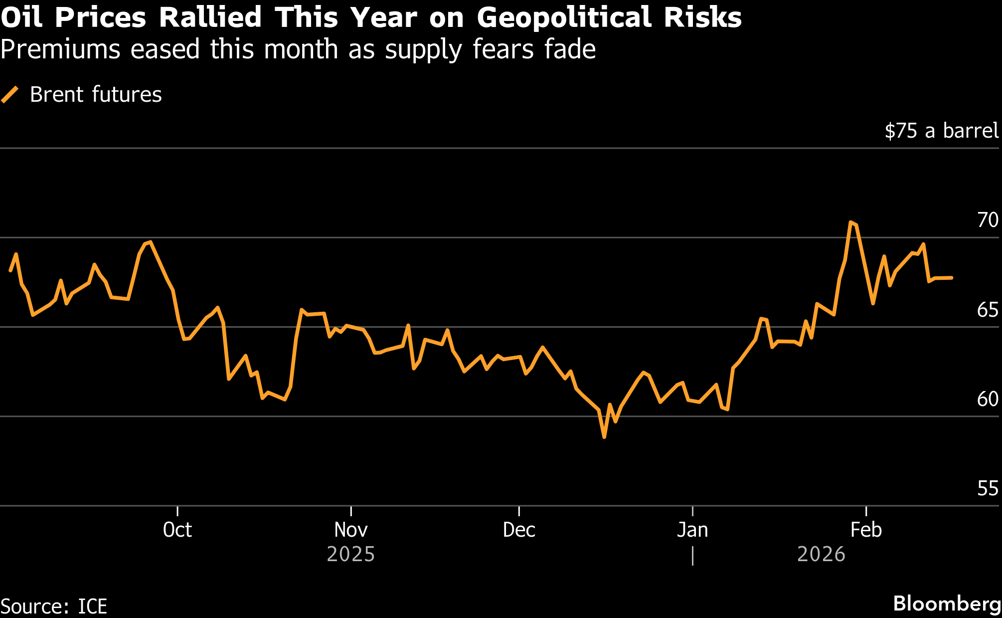 Brent traded close to $68 a barrel, after its first back-to-back weekly drop this year, while West Texas Intermediate was near $63. US President Donald Trump said Friday that regime change would be the best outcome for Iran, ratcheting up pressure ahead of the negotiations in Geneva.