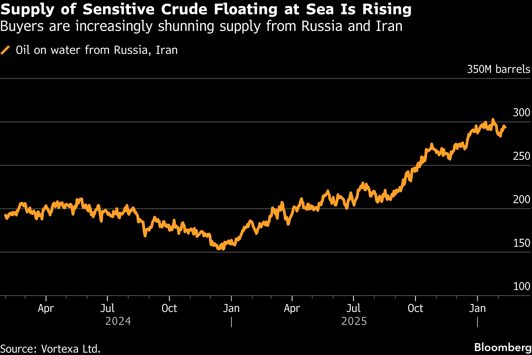 While a flotilla of oil tankers can often be very bearish because it points to oversupply, this time it’s pressuring refiners to look elsewhere for cargoes. There are about 292 million barrels of Russian and Iranian crudes currently on the water, more than 50% higher than a year ago, according to ship-tracking firm Vortexa Ltd. Of that figure, 140.5 million barrels are Russian — close to double the level a year ago — while 151 million are Iranian, the data showed.