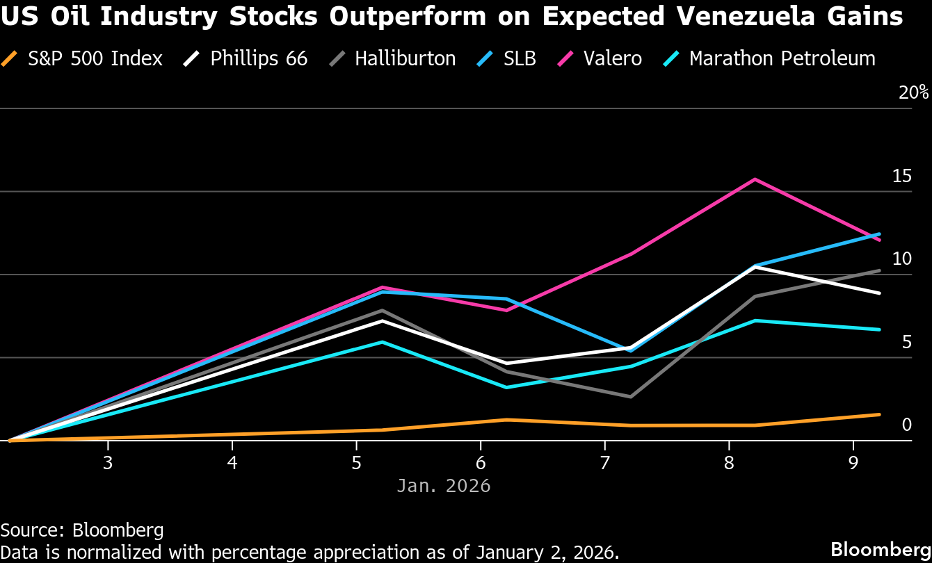 One of the most intriguing opportunities involves who will refine Venezuela’s heavy crude, and investors have already pushed shares of some US refiners higher. About 140 million barrels of Venezuelan crude ran through US refiners in 2025, accounting for 0.8% of total US throughput, according to Tudor Pickering Holt & Co. Greater flows into the US would favor complex refiners such as Valero Energy Corp. and PBF Energy Inc., according to Bloomberg Intelligence.