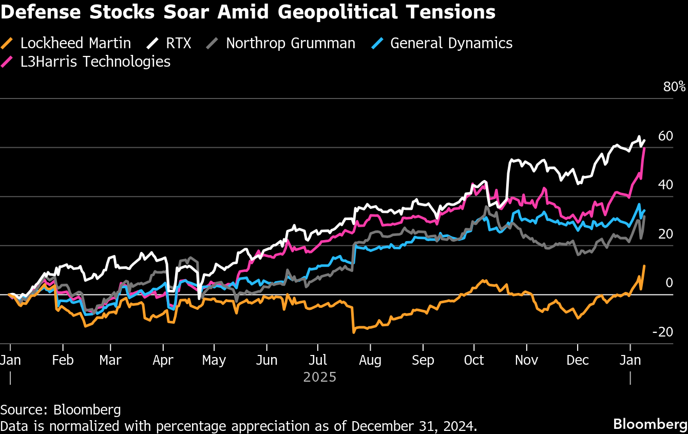 Heightened geopolitical uncertainty following Maduro’s capture as well as Trump’s push to increase the US military budget has fueled a global rally in defense companies. Lockheed Martin Corp., RTX Corp., Northrop Grumman Corp., Elbit Systems Ltd. and General Dynamics Corp. could be beneficiaries, wrote David Miller, chief investment officer at Catalyst Funds.