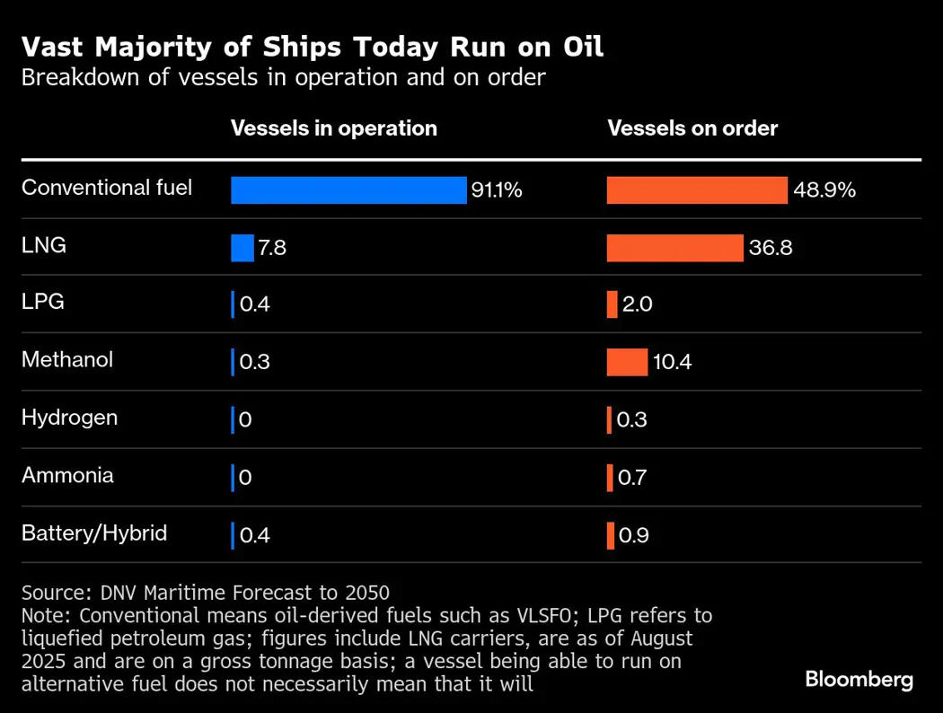 The Brave Pioneer encapsulates the difficulties of decarbonizing an industry which has greenhouse gas emissions that are bigger than Germany’s. Traditional fossil fuels are much cheaper than alternatives, a challenge that’s being exacerbated by slumping oil prices as the market contends with a surplus. A global carbon tax for ships would have helped bridge the price gap, but those plans are now on hold, adding to uncertainty for transition-focused investments.