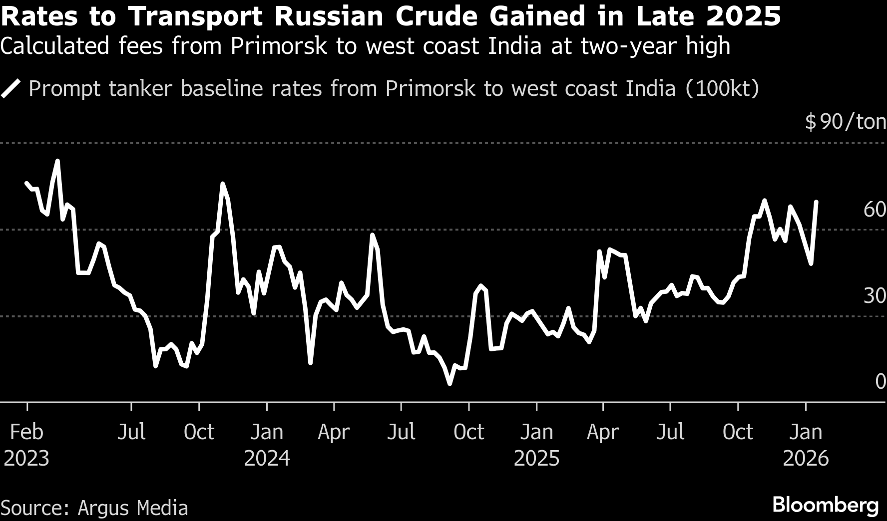 The average rate charged to transport Russian Urals oil from Primorsk to India’s west coast rose to more than $60 per ton in late December, the highest level in two years, according to data compiled by Argus Media. That compares with around $25 at the beginning of last year.
