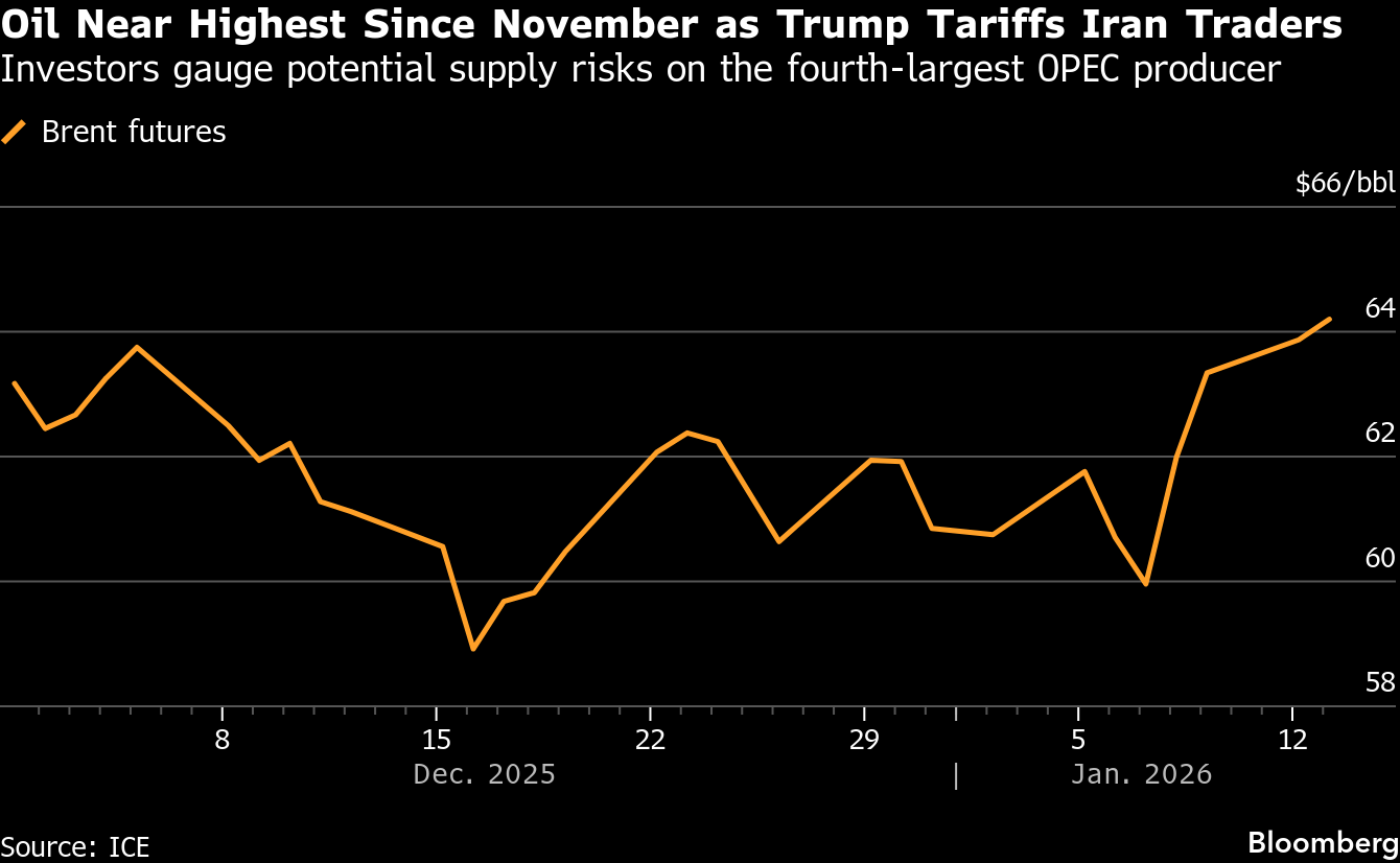 Brent futures extended gains of more than 6% over the previous three sessions. President Donald Trump announced a 25% tariff on goods from countries “doing business” with Iran and has not ruled out military strikes on the Persian Gulf state, just days after a stunning move to take control of Venezuelan oil production.
