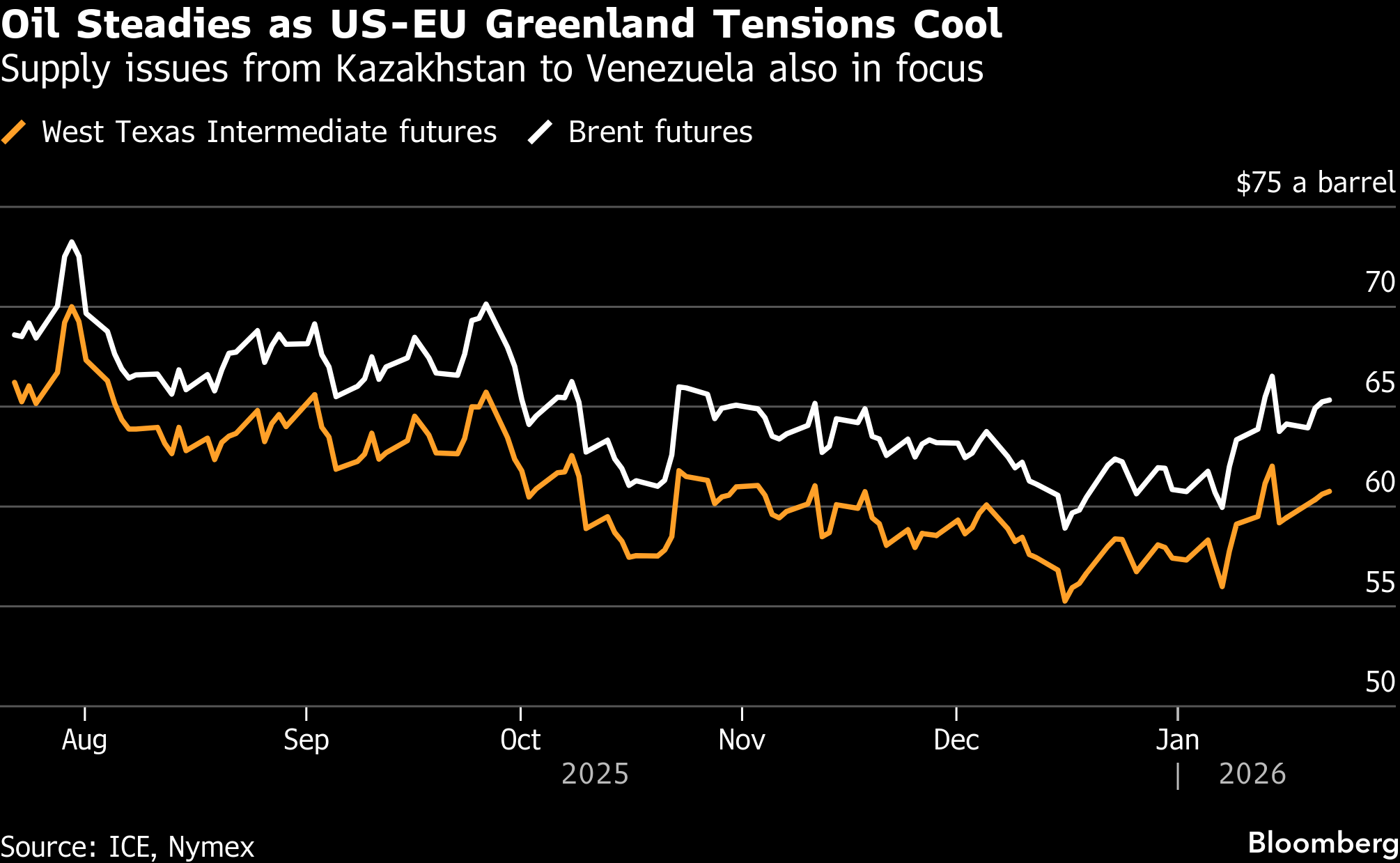 (Bloomberg) -- Oil steadied as geopolitical tensions over Greenland cooled, aiding wider markets and offsetting an array of issues over supply.