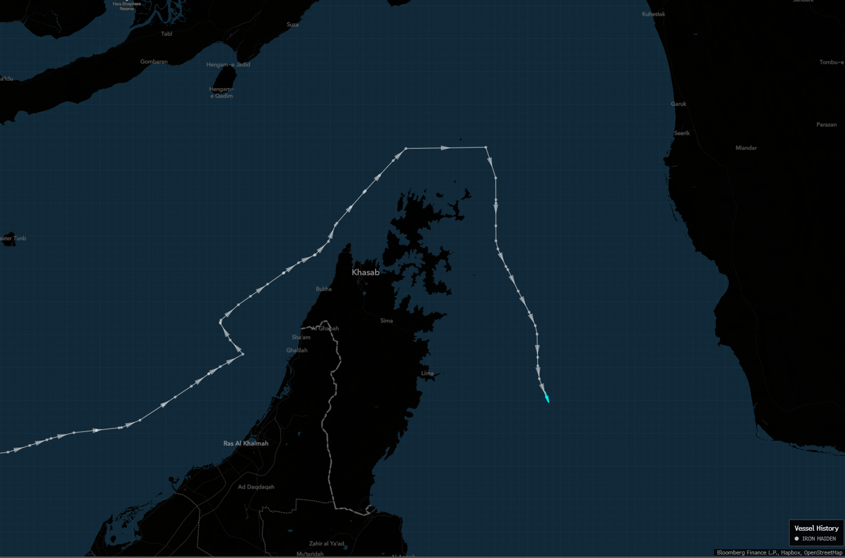 The Iron Maiden changed its destination signal to “CHINA OWNER” from “For Orders” early Thursday as it made a break through the passage while hugging the Omani coastline, according to ship-tracking data from Bloomberg and Kpler. The vessel had been in the Gulf since December delivering several shipments, Kpler data show.