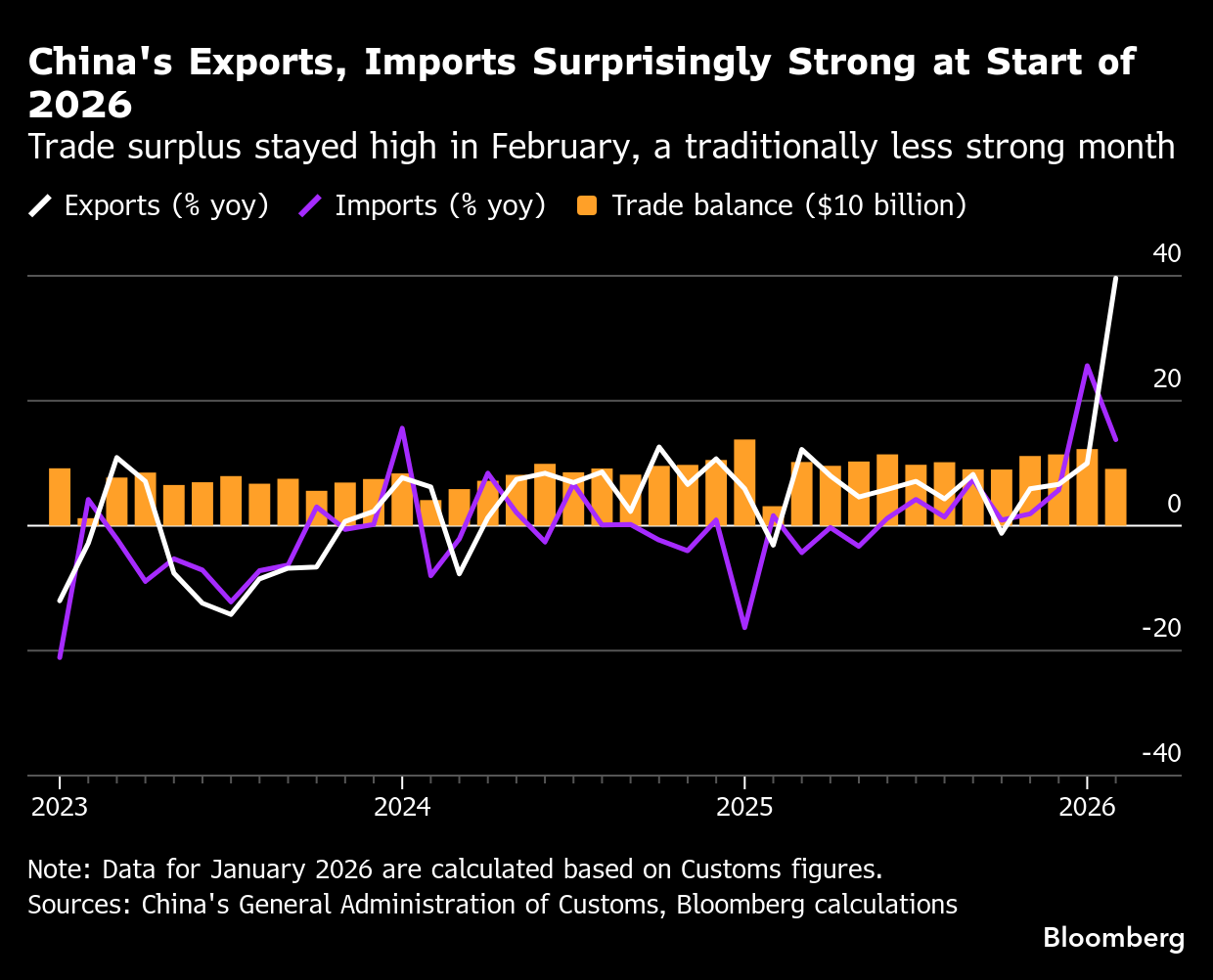 While China usually first publishes only combined trade figures for January and February to smooth out distortions caused by the irregular timing of the Lunar New Year holiday, this time it separately broke out the monthly total for February.