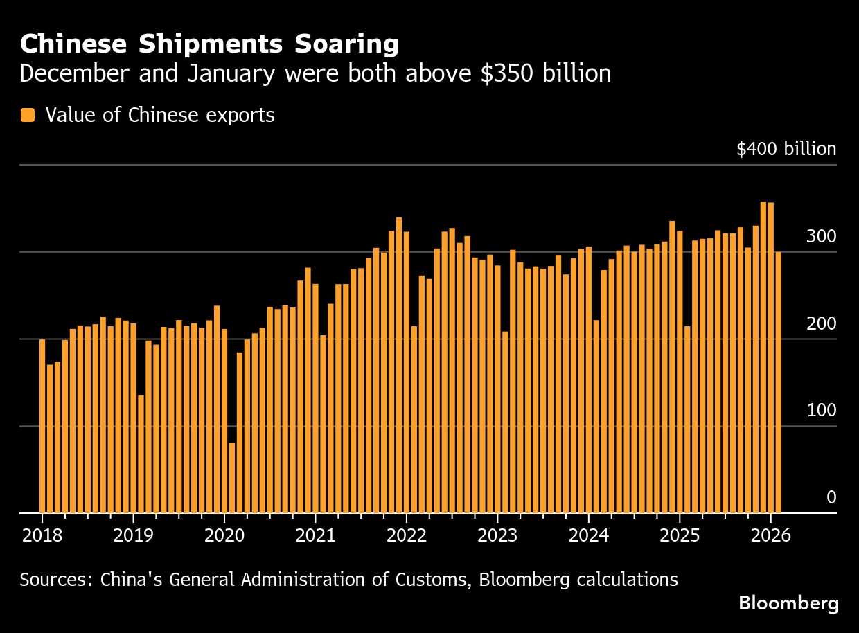 The total value of exports in January was almost $357 billion — the second highest tally for a single month on record, according to Bloomberg calculations based on official data. At the same time, the pullback in February was much less than is usual during the Lunar New Year break.