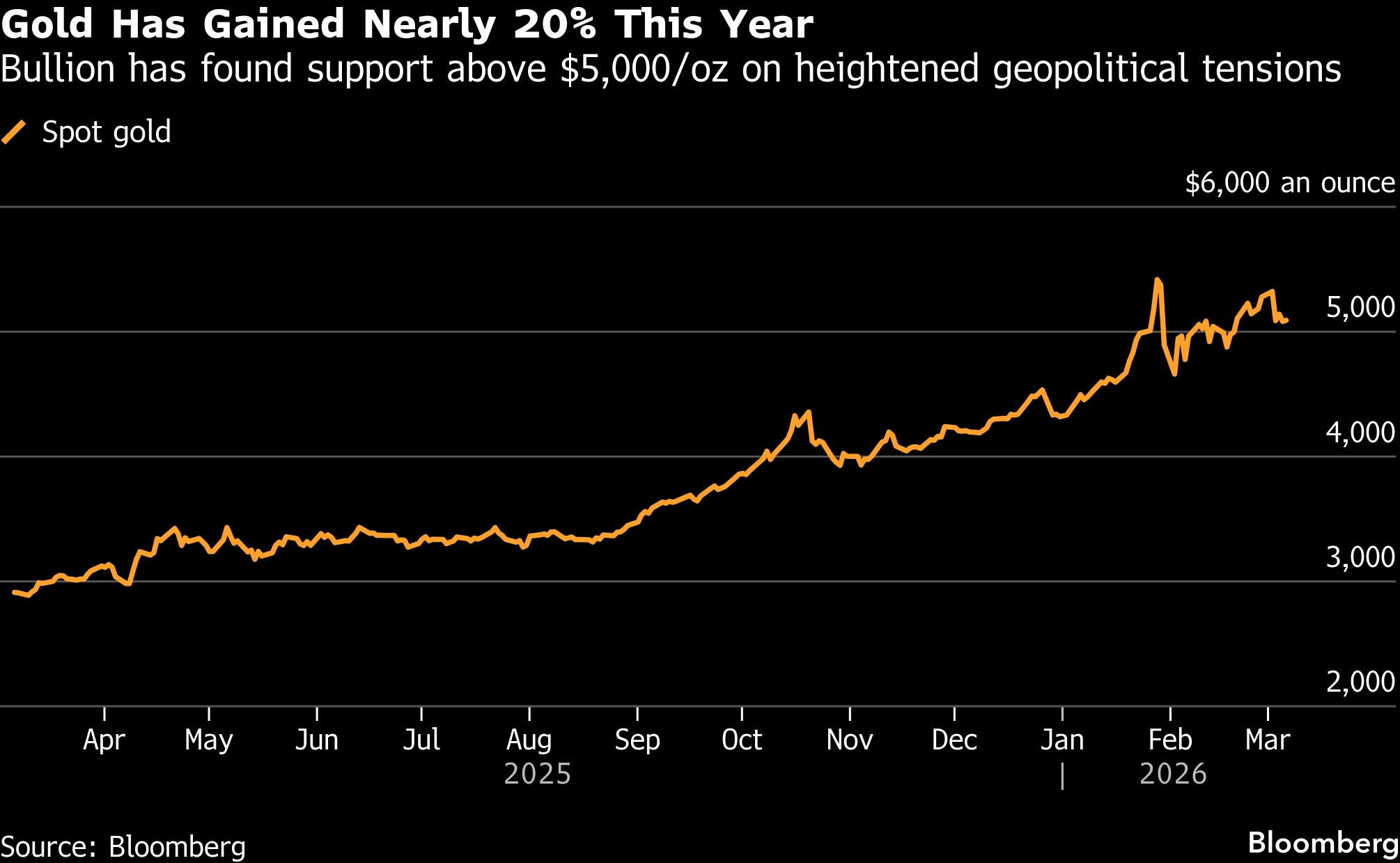 That came as the US-Israeli war with Iran sent oil prices surging and prompted traders to trim bets on the Federal Reserve cutting interest rates. Swaps traders are pricing in about 35 basis points of rate cuts by year-end, compared with 60 basis points at the end of last week. A stronger dollar and higher borrowing costs are typically negative for gold.