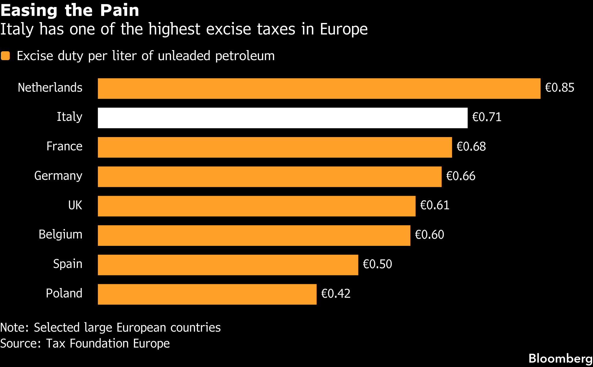 (Bloomberg) -- Italy’s government approved a temporary cut to excise taxes on fuel in a bid to help citizens deal with higher costs caused by the conflict in the Middle East.