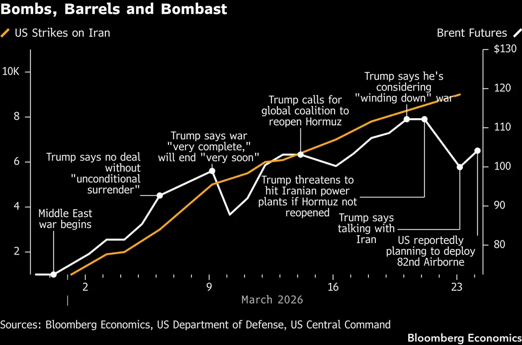 “The increasingly soothing US rhetoric about potential peace negotiations is the focus for investors as they drive stocks and bonds higher, along with sending crude futures lower. That may be a vulnerable strategy given that the actions of the three main parties to the conflict — the US, Iran and Israel — signal very little actual de-escalation.”