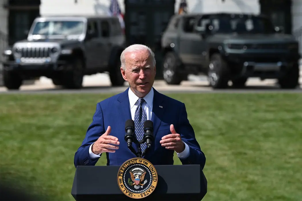 Several electric and hybrid vehicles were arrayed behind Biden as he spoke, including the Ford F-150 Lightning, Chevrolet Bolt, Jeep Wrangler Limited Rubicon 4xE, GMC Hummer EV and Ford E Transit Van.