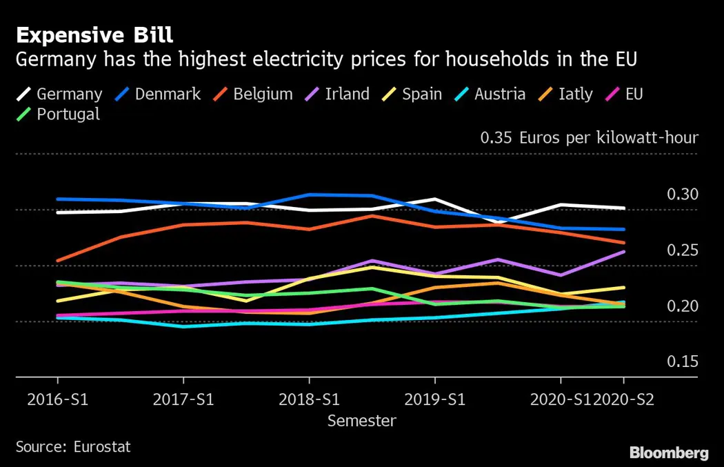 A supply squeeze would send power prices soaring for the many thousands of companies that make up the backbone of the economy. Wholesale rates have already jumped almost 60% this year to their highest level since 2008. That increase will feed through to the nation’s 40 million homes already paying the highest bills in the European Union, partly to fund the energy transition.