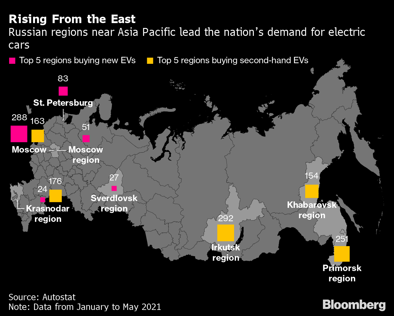 More than a fifth of all electric vehicles imported to Russia between January and May were sold in Khabarovsk and other areas of eastern Russia — even though the region claims just 4% of the nation’s population, according to data from the Moscow-based analytical agency Autostat. The country’s capital, home to at least twice as many people, accounted for just 14% of EV sales.