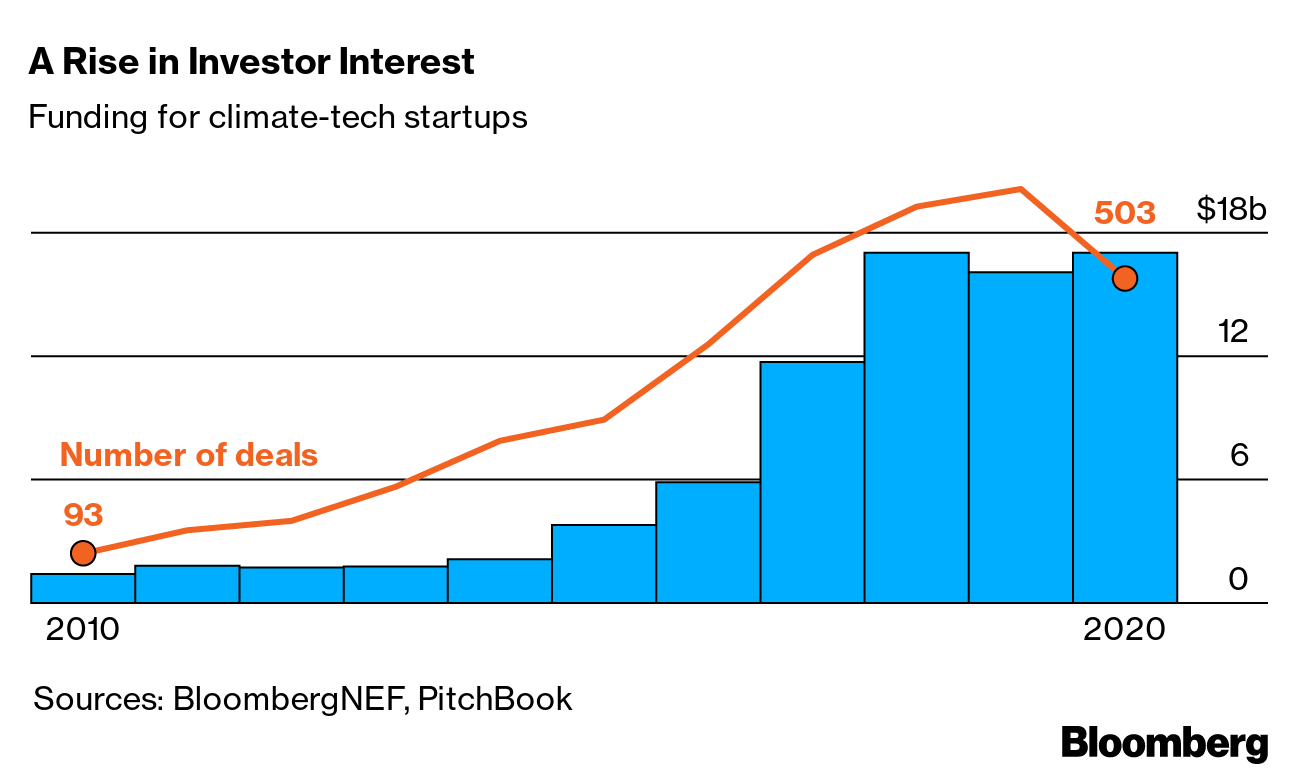 Plug Power’s renaissance was emblematic of a broader revival in the cleantech sector. As the cost of batteries and wind and solar power declined, new technologies became economically competitive. Tesla Inc.’s stock surged more than 700% in 2020, making it one of the world’s most valuable companies. Funds tracked by BloombergNEF pumped more than $17 billion into climate-related startups last year, up from $1.4 billion a decade earlier.
