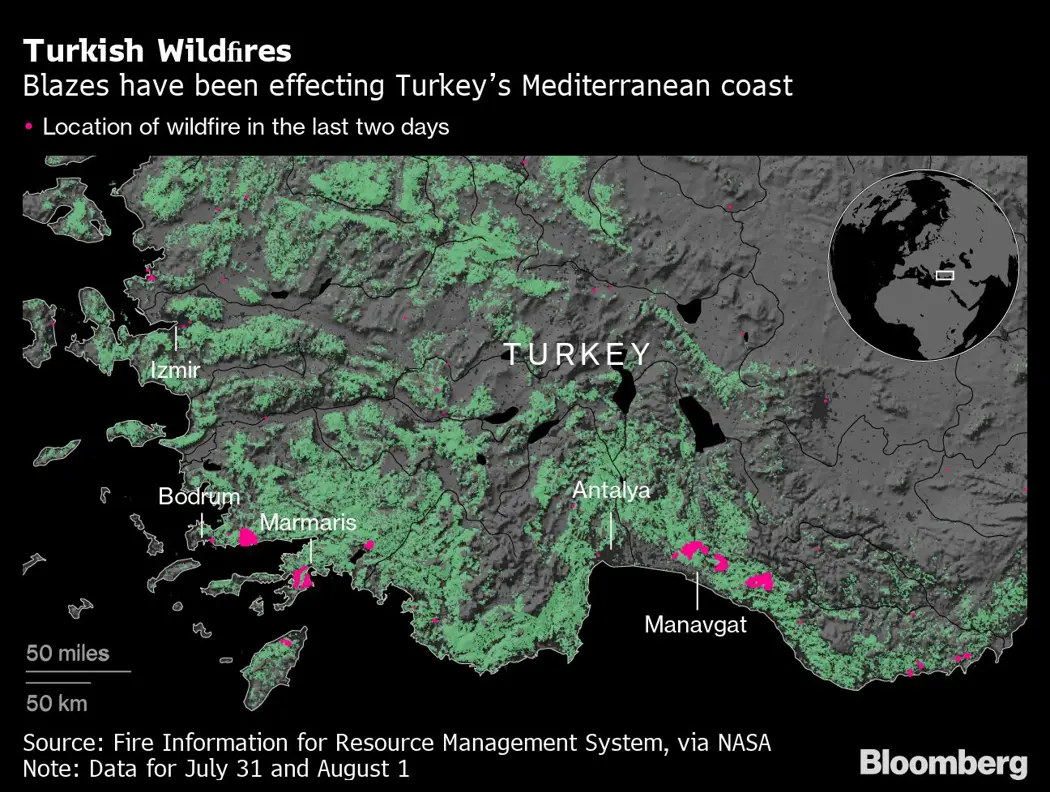 (Bloomberg) -- Wildfires ravaging Turkey’s picturesque coasts and a flailing government response are adding to the list of political woes for an increasingly unpopular President Recep Tayyip Erdogan.