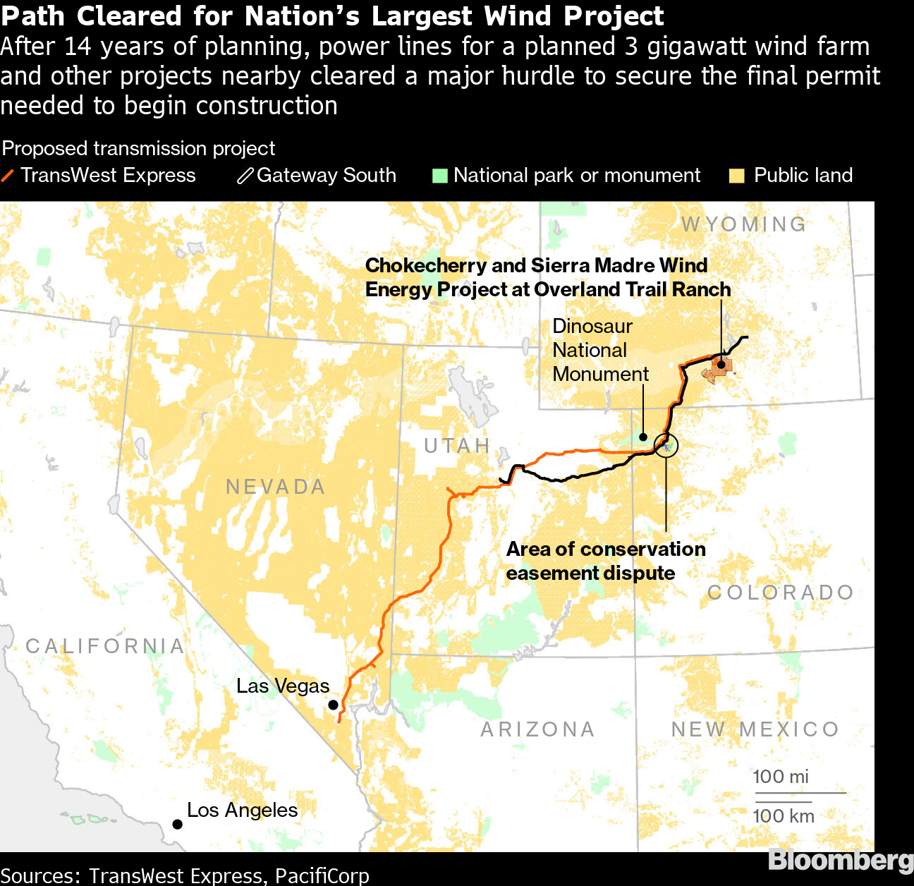 Anschutz’s project, called TransWest, will run for 732 miles (1,178 kilometers), connecting a 3,000-megawatt Wyoming wind farm to Las Vegas. The transmission project turned 14 years old last month. PacifiCorp’s project, Gateway South, will run about 400 miles, bringing additional wind power from Wyoming to Utah.