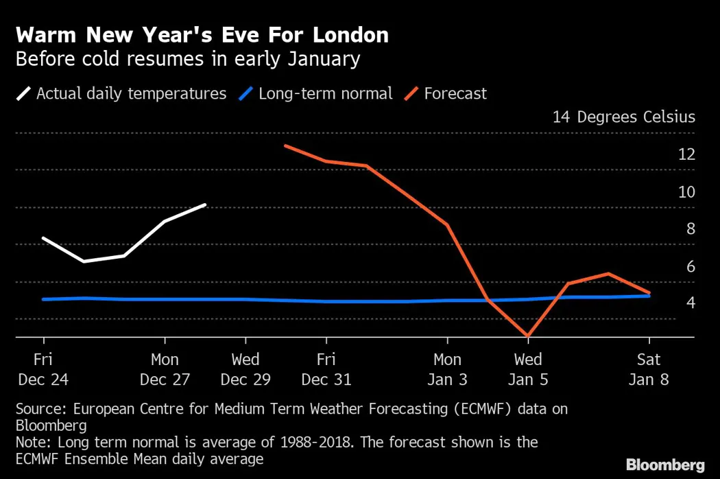 The temperature in the British capital could rise as high as 15 degrees Celsius (59 degrees Fahrenheit) on Dec. 31, according to a forecast from the U.K.’s national weather service. It’s likely to be even warmer in the southwest of the country, where the previous record for the warmest New Year’s eve in England was set in 2011.