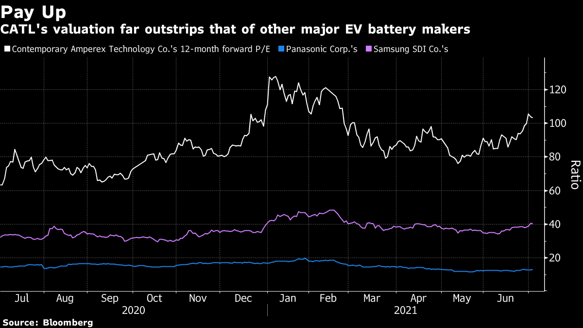 To be sure, the rich valuations of some new energy stocks are starting to elicit caution among other investors: CATL is trading at 102 times 12-month forward earnings estimates -- about eight times that of rival Panasonic Corp.; Yunnan Energy boasts a valuation of 82 times, near an all-time high multiple of 89.
