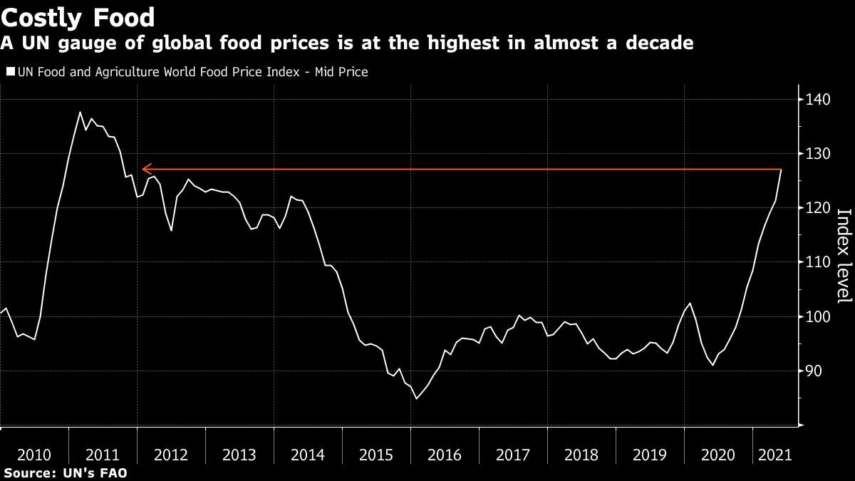 The rally in food prices has raised the cost of everything from pizza dough to meat and coffee. That could push more people into hunger, while threatening faster inflation that may prompt central banks to tighten stimulus measures for economies still in recovery mode after the pandemic.