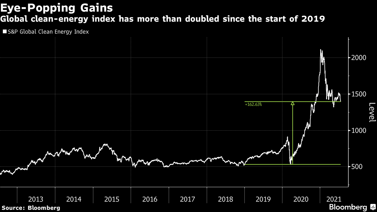 The S&P Global Clean Energy Index, which includes NextEra and Orsted, has advanced 177% since the start of 2019, and that includes this year’s decline of 21%.