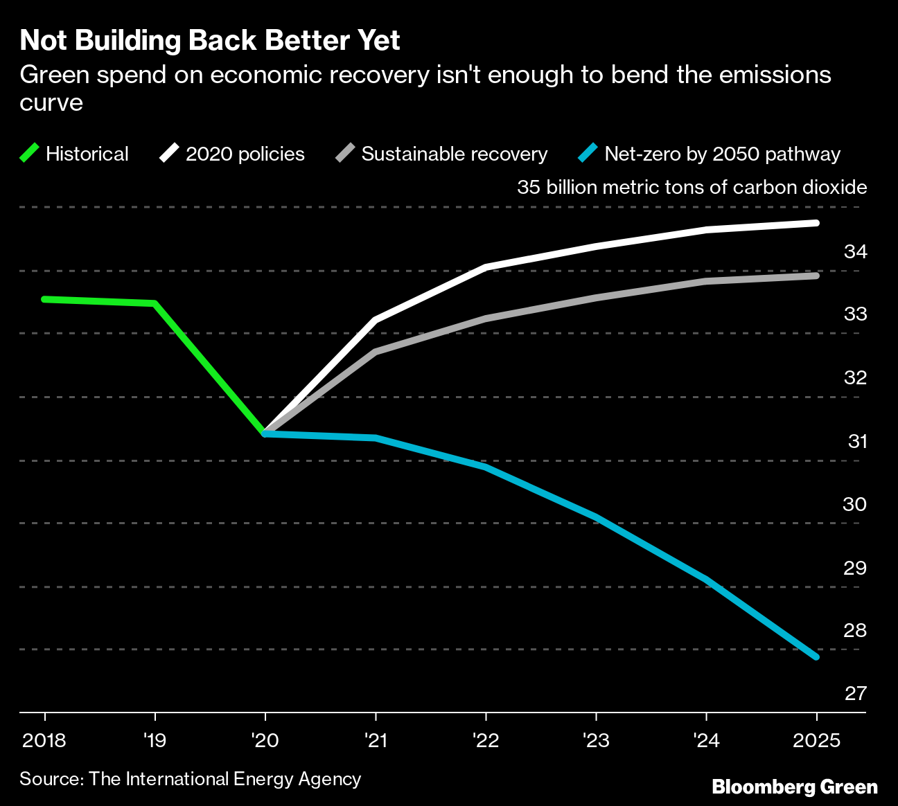 (Bloomberg) -- Less than 15% of the $2.4 trillion in government spending to support the post-pandemic economic recovery has gone to investments in clean energy, according to the International Energy Agency.