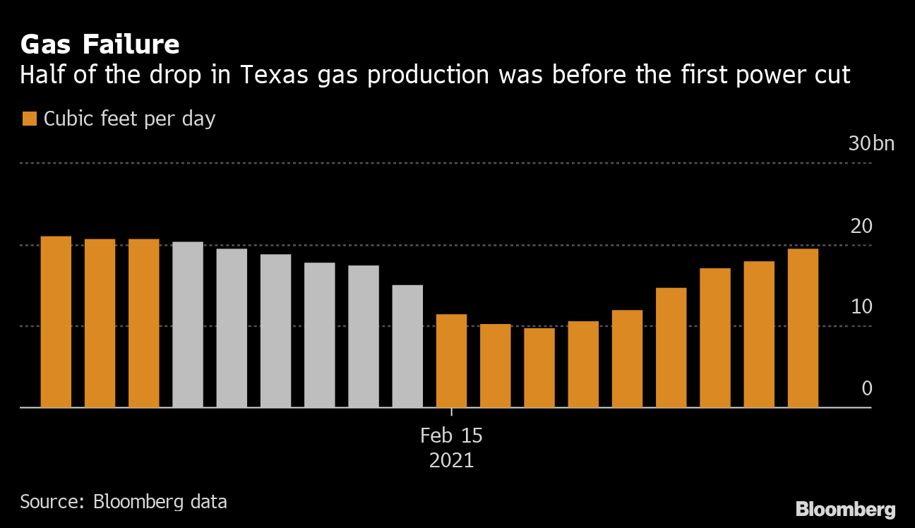 As the cold weather swept through west Texas, the state’s gas production tumbled by some 11 billion cubic feet over nine straight days from Feb. 9. Crucially, 52% of the drop in volume came before ERCOT’s first power cut in the early hours of Feb. 15, according to data compiled by BloombergNEF.