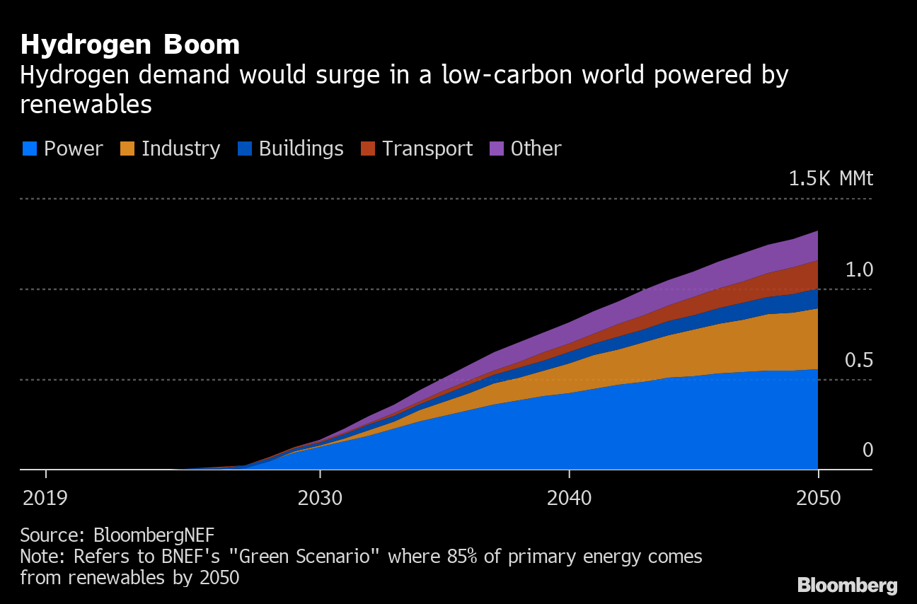 In all of BNEF’s scenarios, hydrogen will need to be a bigger source of energy for applications like heavy industry and chemicals production. That could lead to demand of as much as 1,318 million metric tons of hydrogen in 2050, making up about 22% of total final energy consumption, compared with less than 0.002% today.