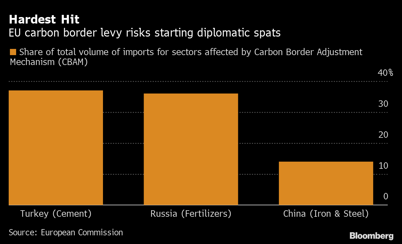 The EU’s levy would apply to steel, cement, aluminum, fertilizer and electricity, and is likely to upend trade and become a new source of international tension. Turkey, Russia and China are among the most affected countries and may choose to dispute the measure as anti-competitive in the WTO. The EU says it’s in line with international trade rules, and points out that it targets products, not countries.