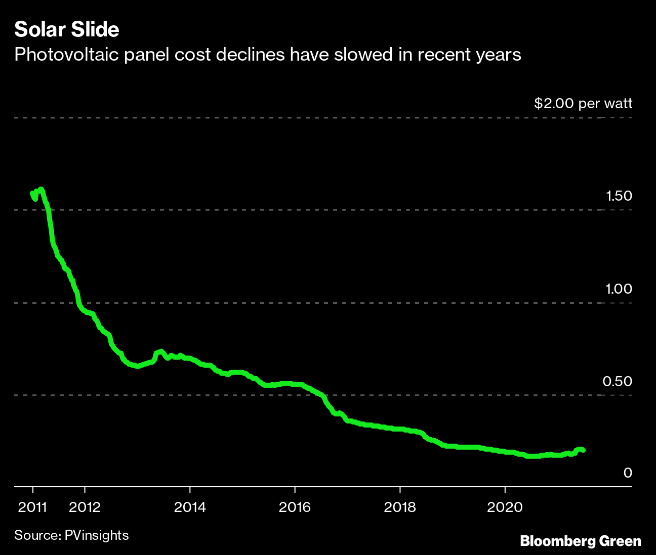 A push for more powerful solar equipment underscores how further cost reductions remain essential to advance the shift away from fossil fuels. While grid-sized solar farms are now typically cheaper than even the most advanced coal or gas-fired plants, additional savings will be required to pair clean energy sources with the expensive storage technology that’s needed for around-the-clock carbon-free power.